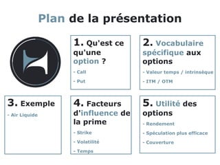 Le document présente une introduction aux options financières, expliquant la différence entre les options d'achat (call) et de vente (put), ainsi que leur utilité en matière de rendement, spéculation et couverture. Il aborde les éléments clés tels que la valeur intrinsèque, la valeur temps, et les facteurs influençant la prime des options. Des exemples concrets illustrent comment les options peuvent être utilisées pour spéculer sur le marché des actions.