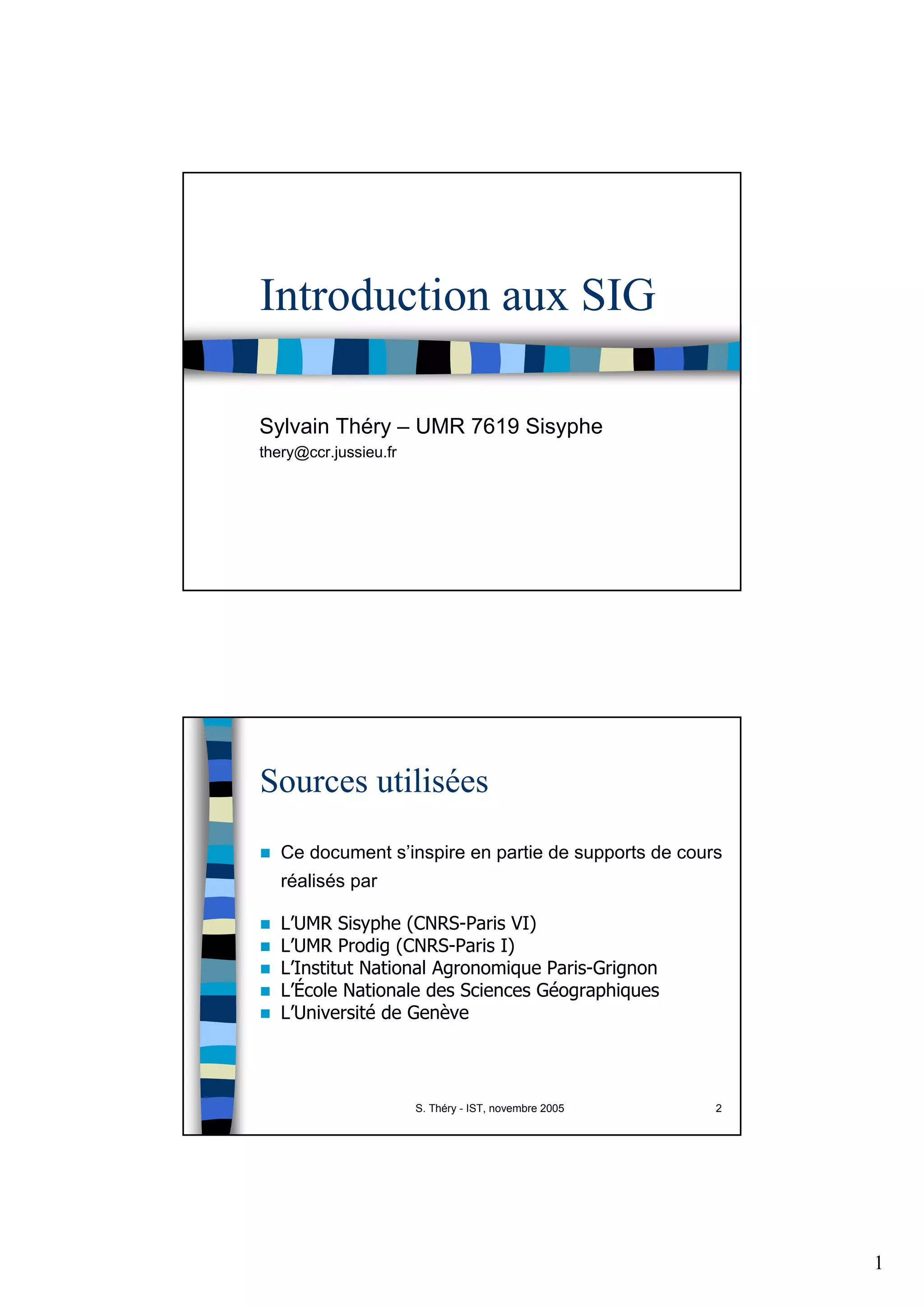 Ce document présente une introduction aux systèmes d'information géographique (SIG), expliquant leur définition, fonctions, types de données et notions de géodésie. Les SIG permettent de gérer des données géographiques à travers des modules de traitement pour l'abstraction, l'acquisition, l'archivage, l'analyse et l'affichage de ces données. La compréhension des projections cartographiques et des systèmes géodésiques est essentielle pour leur utilisation effective.