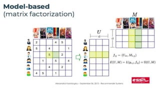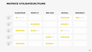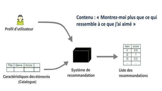 Le document présente les systèmes de recommandation, qui filtrent les informations pour suggérer des éléments aux utilisateurs en fonction de leurs préférences. Deux principaux modèles de recommandation sont évoqués : le filtrage collaboratif et l'approche content-based, ainsi que d'autres modèles tels que les recommandations basées sur la popularité ou aléatoires. Il aborde également les processus de construction d'un moteur de recommandation et les différentes techniques utilisées pour analyser les contenus et les préférences des utilisateurs.