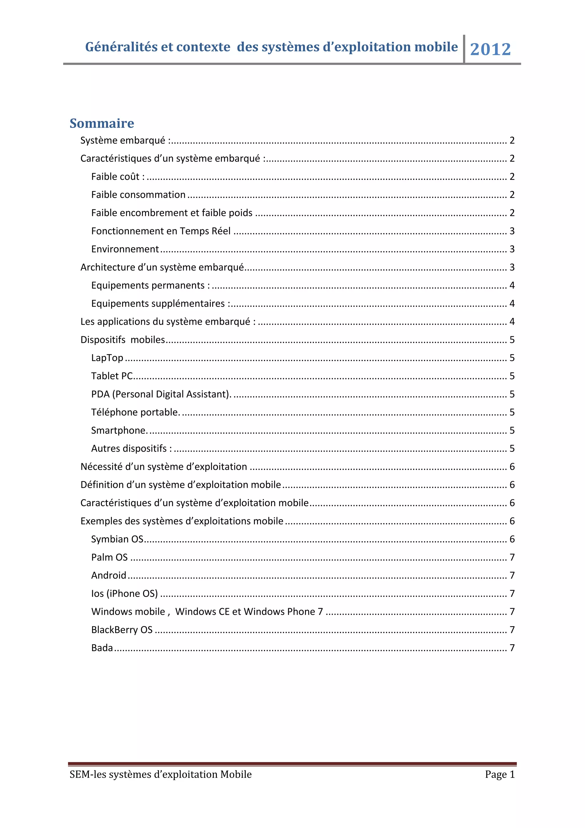 Le document présente une analyse complète des systèmes d'exploitation mobiles et des systèmes embarqués, en soulignant leurs caractéristiques-clés, leur architecture, et leurs applications dans divers dispositifs technologiques. Il détaille également les principaux systèmes d'exploitation mobiles tels qu'Android, iOS et Windows Mobile, chacun ayant des fonctionnalités spécifiques adaptées aux besoins des appareils. Enfin, le texte aborde l'importance de la gestion des ressources et des contraintes auxquelles ces systèmes doivent faire face dans leur fonctionnement quotidien.