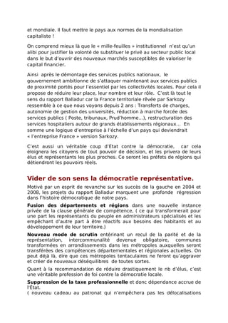 Le document analyse la réforme des collectivités territoriales initiée par Nicolas Sarkozy, dénonçant sa visée de recentraliser le pouvoir au détriment de la démocratie locale. Il critique la réduction des services publics et la fusion des départements et régions, considérant cela comme une attaque contre les fondements républicains et les droits des citoyens. Le texte propose plutôt une réforme visant à établir une démocratie participative et à renforcer le pouvoir des collectivités locales par une meilleure association des citoyens aux décisions politiques.