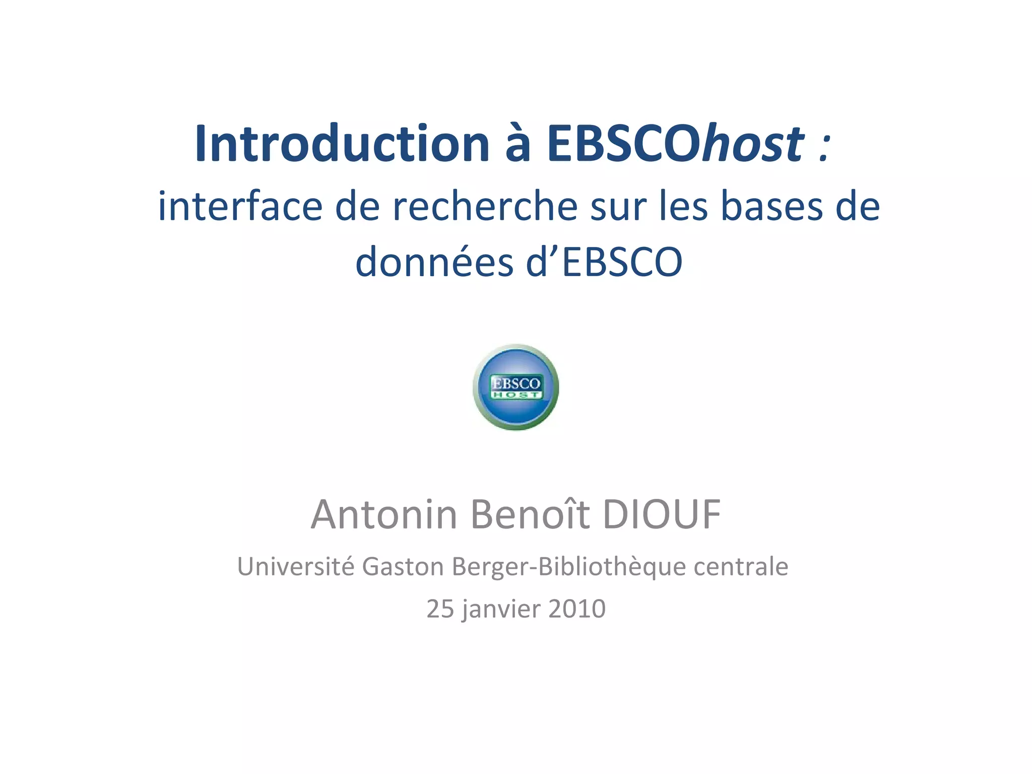 Le document présente EBSCO host, une interface de recherche sur des bases de données électroniques, permettant d'accéder à divers contenus payants. Il décrit les fonctionnalités de recherche simple et avancée, ainsi que les options de personnalisation, les filtres et les outils d'affichage des résultats. Enfin, il explique comment sauvegarder les recherches et utilise une terminologie définie pour faciliter la navigation dans les bases de données.