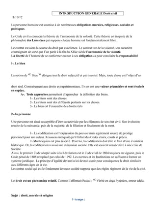 Le document traite des fondements du droit civil, mettant en avant la liberté et l'autonomie de la volonté comme principes centraux, ainsi que la responsabilité qui en découle. Il examine la notion de bien, le rôle de la codification, et l'importance des normes juridiques dans la société, tout en abordant les relations entre droit, morale et religion. Enfin, il souligne que le droit doit être compris dans un contexte historique et social, influençant la vie de la cité.