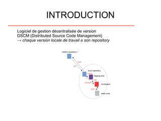 Ce document présente une introduction à Git, un système de gestion de versions décentralisé développé par Linus Torvalds en 2005. Il couvre les concepts de base, les zones gérées par Git, les commandes essentielles et les besoins d'apprentissage pour optimiser l'utilisation de cet outil. Il mentionne également des outils associés et des ressources pour approfondir les connaissances sur Git.