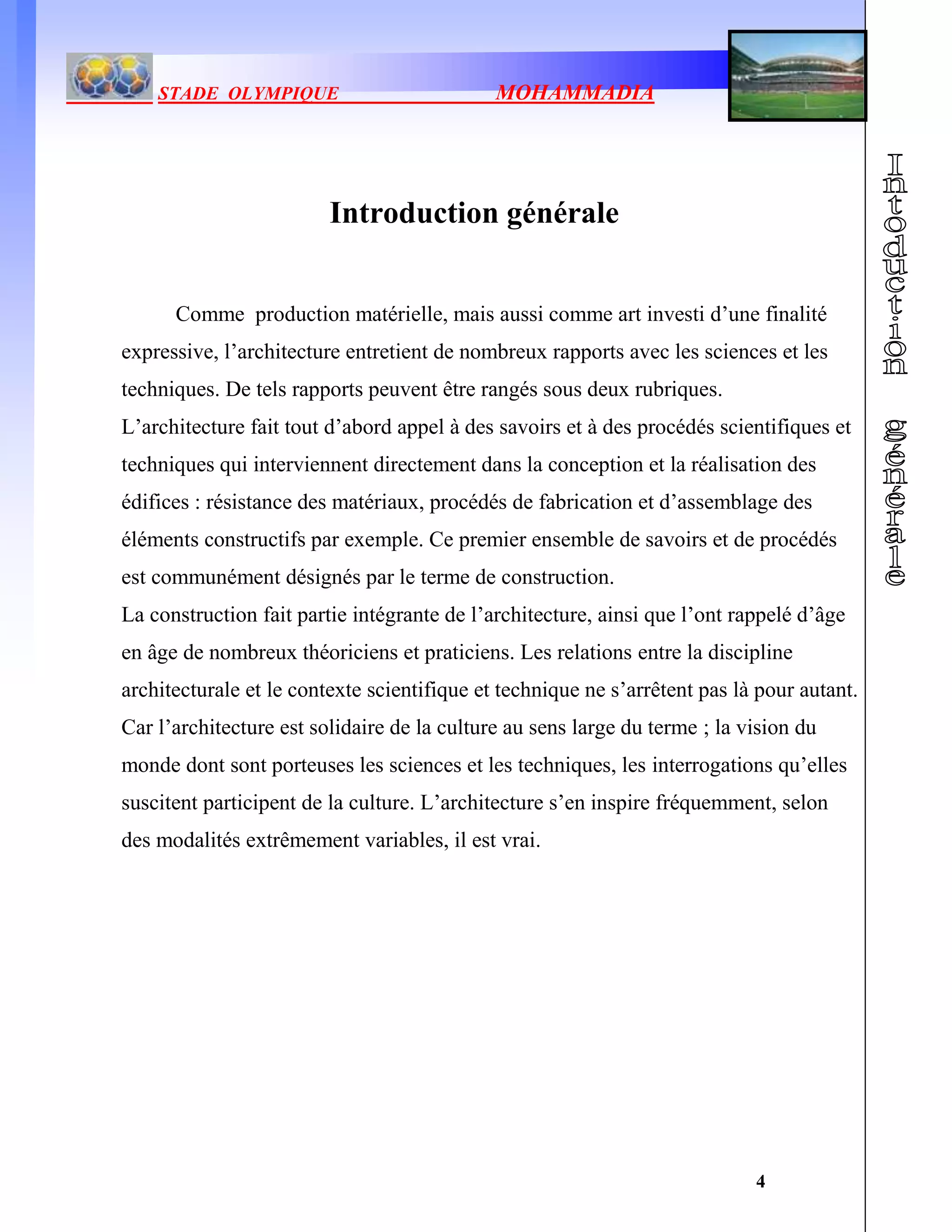 L'architecture est une discipline qui allie production matérielle et expression artistique, reliant science et technique. Elle repose sur des connaissances en construction, telles que la résistance des matériaux et les procédés d'assemblage. De plus, l'architecture est influencée par la culture, intégrant les visions du monde véhiculées par les sciences et techniques.