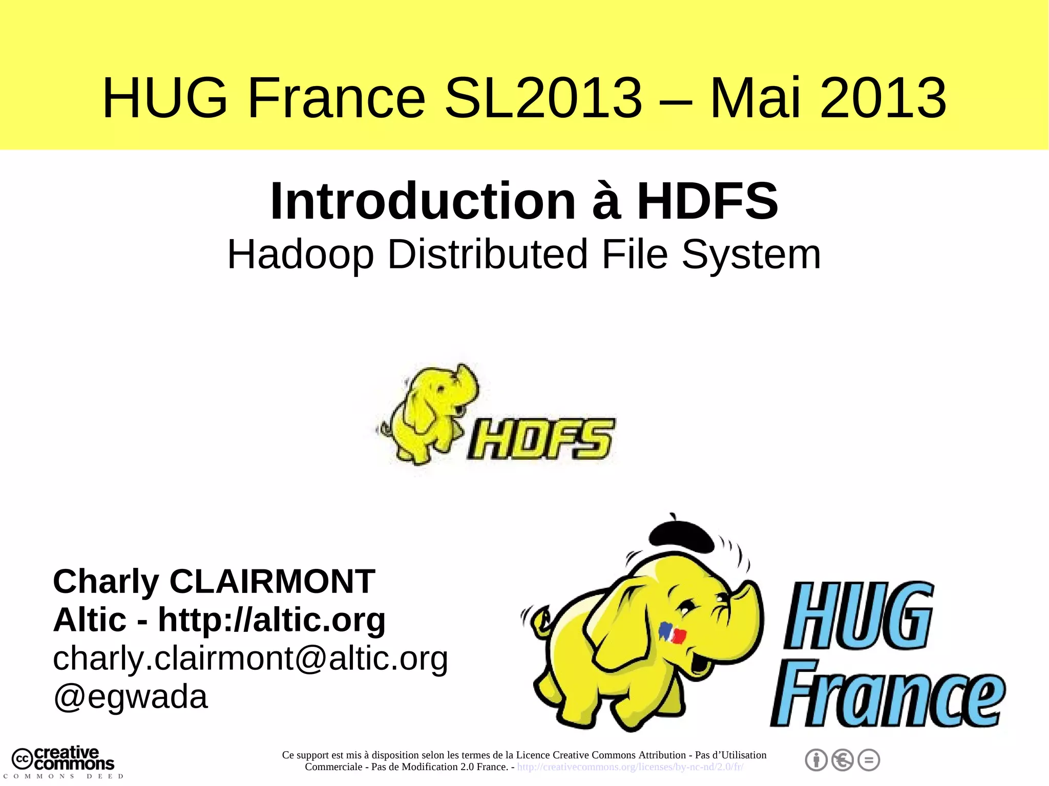 Le document présente HDFS (Hadoop Distributed File System), un système de fichiers distribué conçu pour gérer de larges ensembles de données avec tolérance aux pannes. Il décrit son architecture, les fonctions des composants comme le namenode et les datanodes, ainsi que des exemples d'applications et de commandes HDFS. Les caractéristiques clés incluent la réplication des données, la gestion des métadonnées et une structure optimisée pour le traitement par lots.