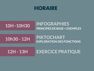 Le document présente des principes de création d'infographies efficaces, soulignant l'importance de l'aspect visuel pour capter l'attention et faciliter la compréhension. Il offre des conseils pratiques sur l'organisation de l'information, le choix des couleurs et des polices, ainsi que l'utilisation de logiciels comme Piktochart. Enfin, il aborde la nécessité de tester et de recueillir des avis pour garantir que le message soit clair et attrayant.