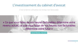 Le document explore les défis et opportunités des cabinets d'avocats face à un environnement en mutation, incluant la nécessité d'améliorer l'efficacité et de s'adapter à la technologie. Il évoque des modèles commerciaux innovants centrés sur la récurrence des revenus et la collaboration, tout en soulignant la libéralisation des services juridiques comme un facteur clé. Enfin, une transformation numérique est nécessaire pour optimiser les opérations et la relation client dans le cadre du 'modern workplace'.