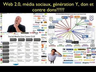 Le document aborde le concept de génération Y et son rapport aux médias sociaux et au marketing moderne, soulignant que cette génération n'est pas homogène et qu'il existe des variations significatives dans leur utilisation des technologies numériques. Il met en évidence l'importance du 'consommacteur' et la nécessité pour les entreprises de comprendre et d'interagir avec leurs clients sur ces plateformes sociales. En outre, il explore la notion de don dans le web 2.0, soulignant comment les interactions en ligne remettent en question des idées traditionnelles sur le commerce et les relations sociales.