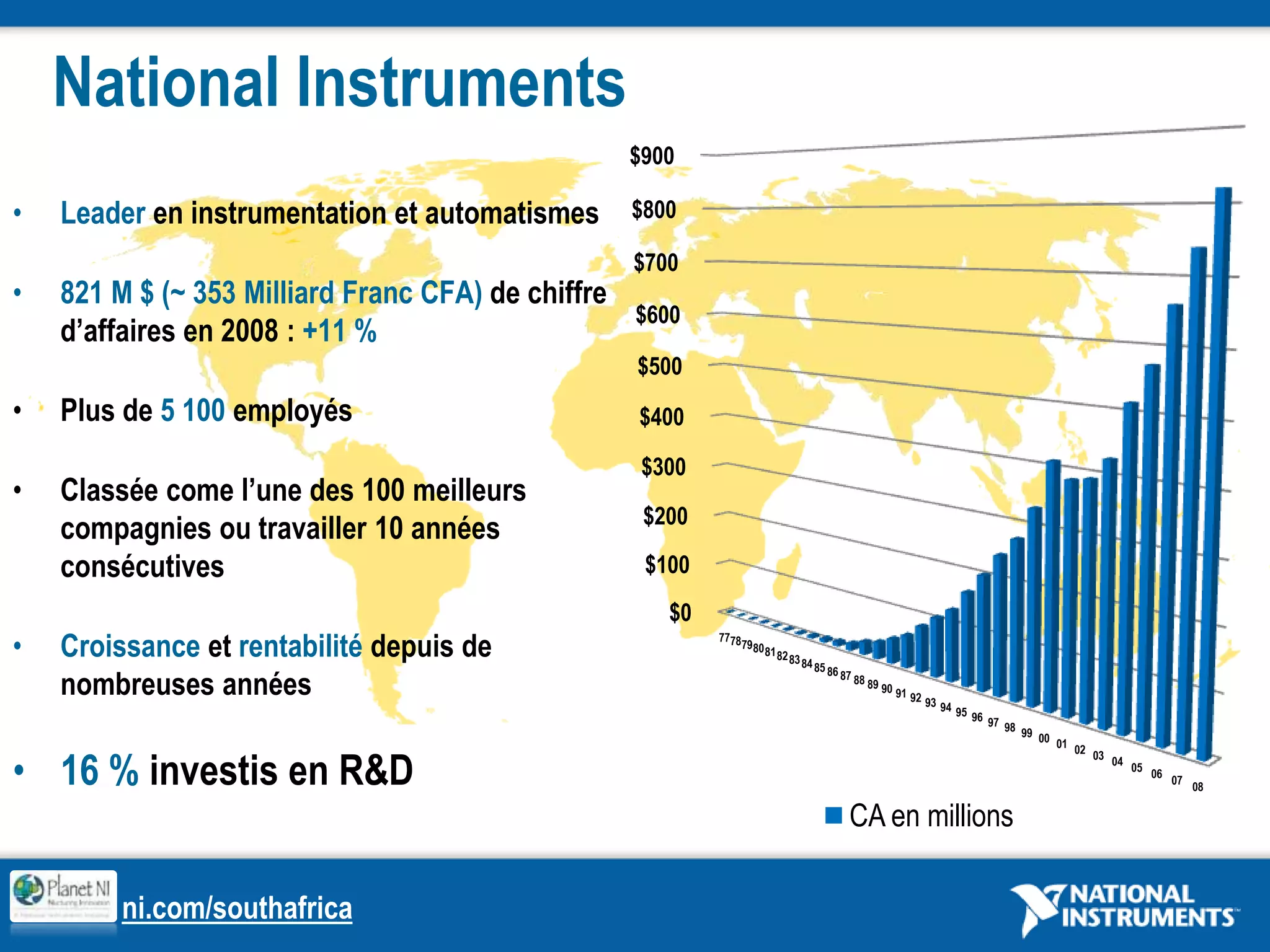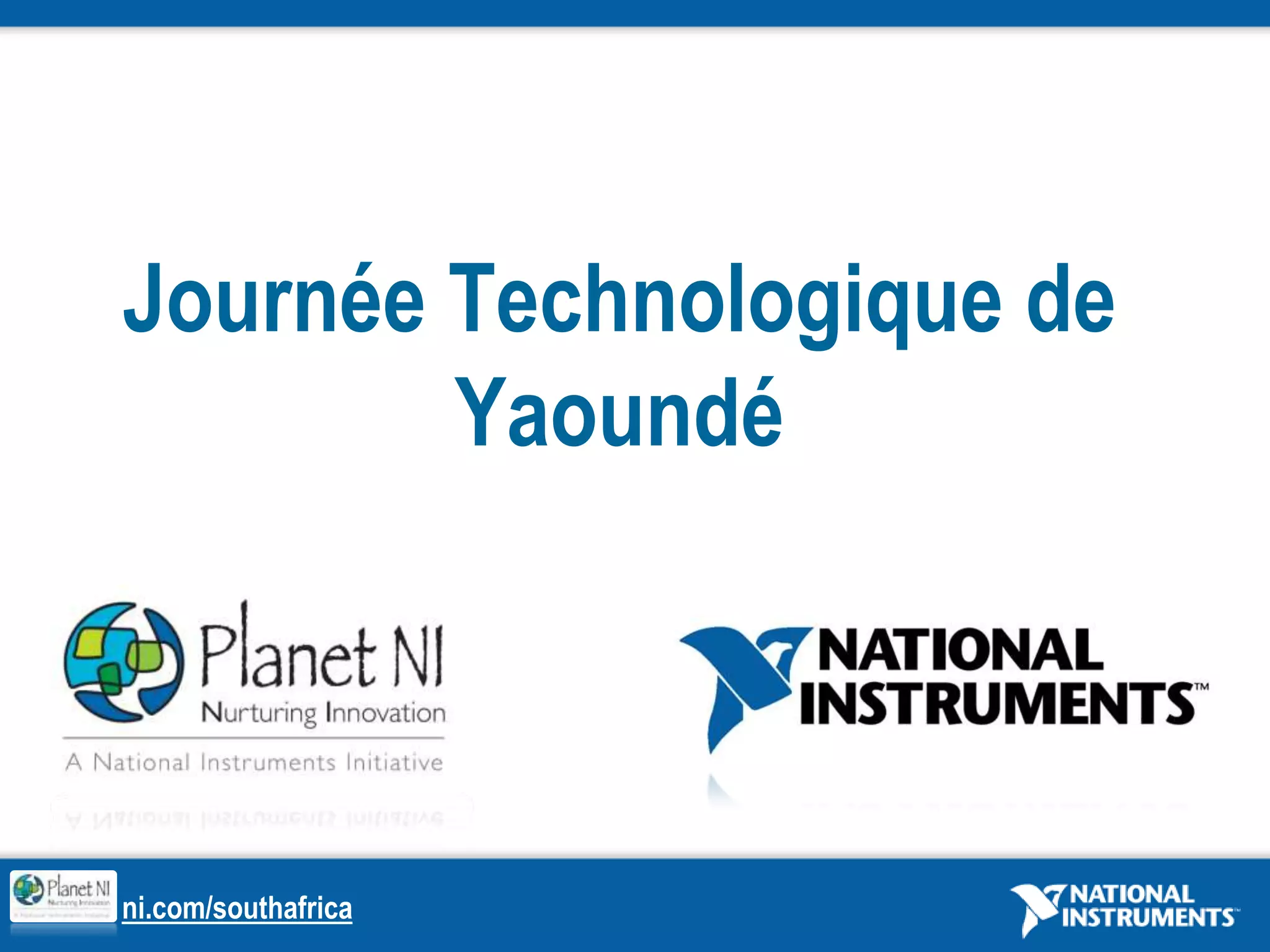 Le document présente National Instruments, une entreprise spécialisée dans l'instrumentation et l'automatisation, avec un chiffre d'affaires de 821 millions de dollars en 2008 et une forte présence mondiale. National Instruments révolutionne la conception de systèmes pour le test et le contrôle, tout en offrant des outils et formations pour les ingénieurs du secteur. Le séminaire au Cameroun vise à rendre la technologie accessible aux ingénieurs locaux afin d'améliorer les conditions de vie dans leurs communautés.