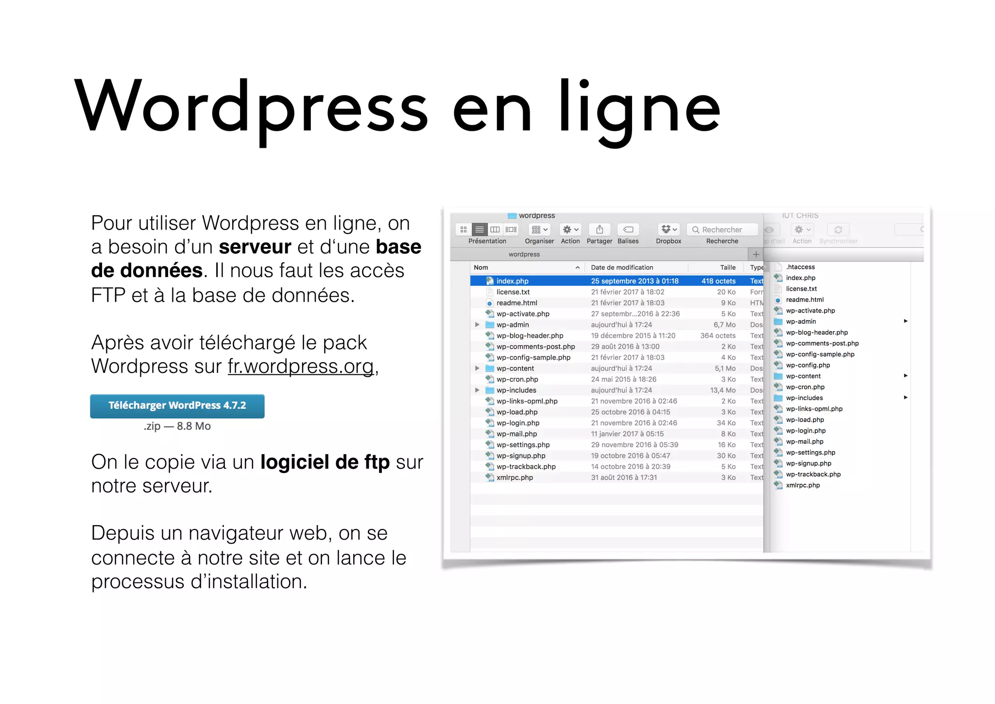 Pour utiliser WordPress en ligne, il est nécessaire de disposer d'un serveur et d'une base de données, suivis de l'installation via FTP. L'utilisateur peut créer un site en fournissant un identifiant et un mot de passe, et gérer facilement des articles et des pages. Grâce à une vaste bibliothèque de thèmes, WordPress permet une personnalisation étendue pour répondre aux besoins des utilisateurs.