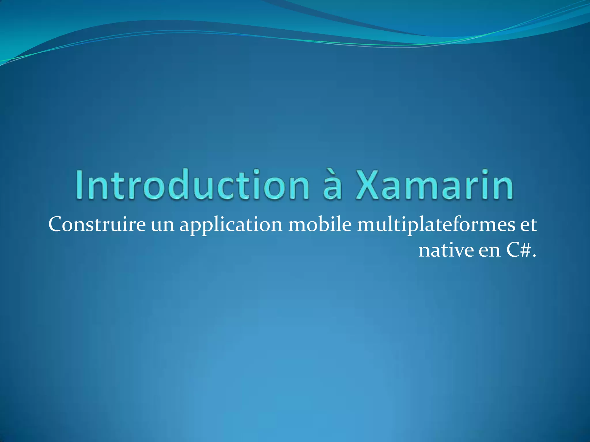 Le document décrit l'évolution de Xamarin, un framework permettant de créer des applications mobiles multiplateformes en C#, en présentant son historique depuis la création de Mono en 2001 jusqu'aux récentes versions de Xamarin. Il souligne les avantages d'utiliser Xamarin, notamment le partage de code entre différentes plateformes, ainsi que les spécificités des applications natives en termes de performance et d'accès aux fonctionnalités. En outre, il aborde l'architecture des composants, les méthodes de partage de code et quelques limitations à prendre en compte pour les développeurs.