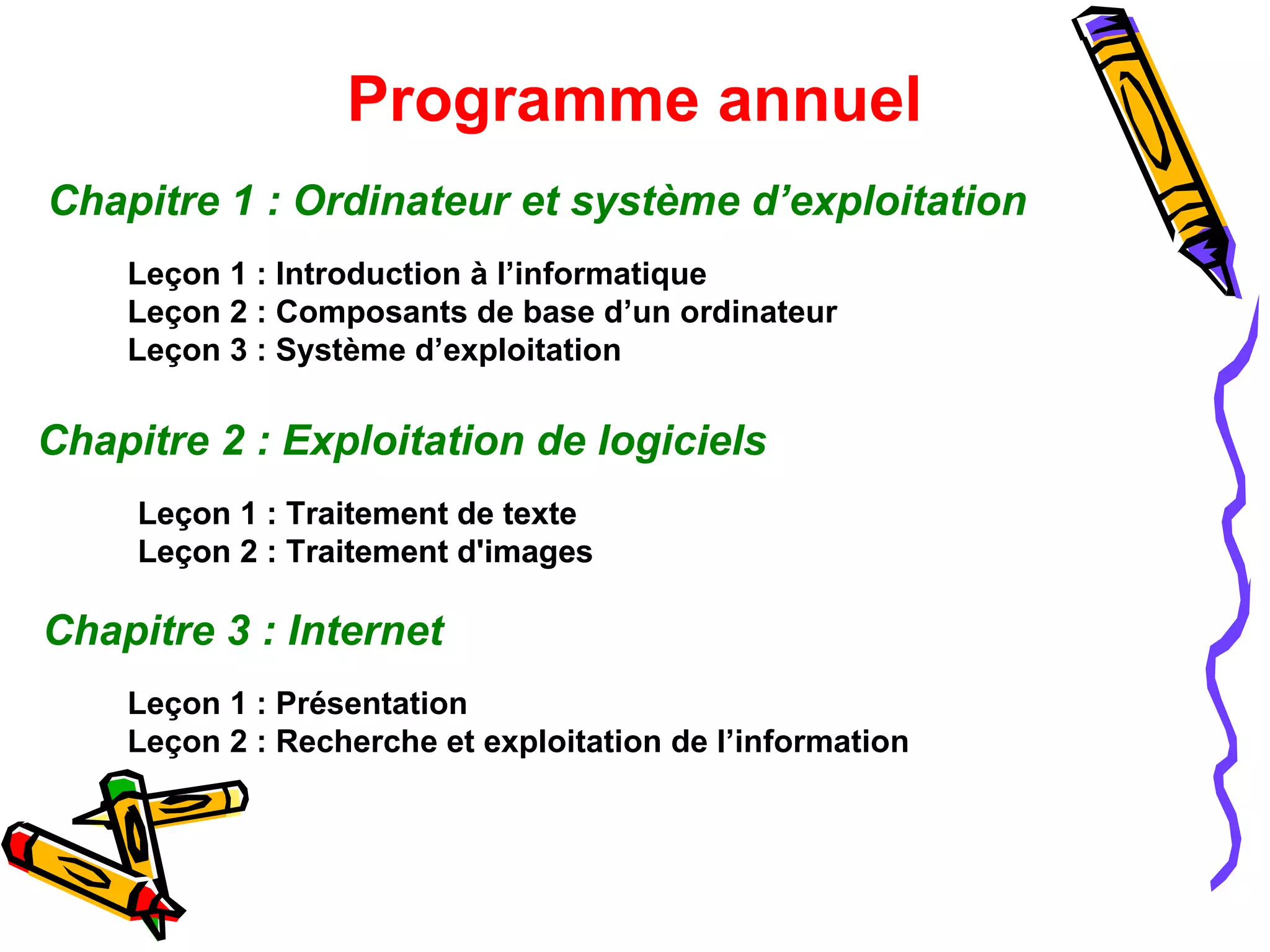 Le document présente un programme annuel d'initiation à l'informatique, couvrant des leçons sur les composants de l'ordinateur, les systèmes d'exploitation, et le traitement de l'information. Il inclut des activités pratiques pour familiariser les étudiants avec les périphériques et les concepts liés à l'informatique. Le programme aborde également les applications de l'informatique dans divers domaines, tels que la médecine et l'industrie.