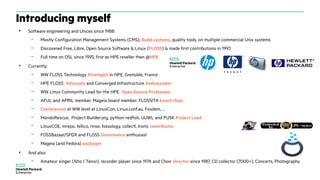 Le document présente une introduction au logiciel libre, libre et open source (FLOSS) et leurs licences, en insistant sur les impacts culturels, économiques et politiques de l'accès libre à l'information. Il décrit les libertés accordées par les logiciels libres et les enjeux de la propriété intellectuelle, tout en explorant le développement collaboratif et les modèles de gouvernance au sein des communautés FLOSS. Ce texte souligne également l'importance des contributions et de la participation à ces projets pour favoriser une culture de partage et d'innovation.