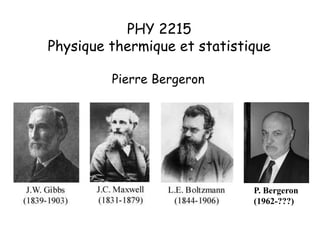 Le document traite de la physique thermique et statistique, en mettant l'accent sur les contributions de Ludwig Boltzmann à la mécanique statistique. Il explique l'importance d'étudier les propriétés microscopiques des systèmes pour comprendre les phénomènes thermodynamiques macroscopiques, reliant ainsi une approche statistique aux concepts de base en thermodynamique. Le cours couvrira des notions de mécanique statistique, de travail et chaleur, ainsi que des applications de la thermodynamique statistique.