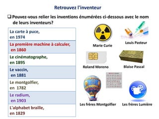 Le document présente une liste d'inventions et leurs inventeurs, incitant à relier chaque invention à son créateur. Il pose également plusieurs questions sur l'origine de certaines inventions et leur lien avec des inventeurs célèbres. Les questions portent sur des inventions variées allant de la machine à calculer à l'hélicoptère.