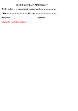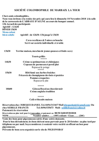 La société colombophile de Marbaix la Tour organise une remise des prix le 10 novembre 2018, accompagnée d'un banquet. Les participants doivent réserver avant le 6 novembre, avec un coût de 40€ pour les adultes et 20€ pour les enfants. Des bons pour pigeonneaux seront également vendus, et une soirée dansante suivra l'événement.