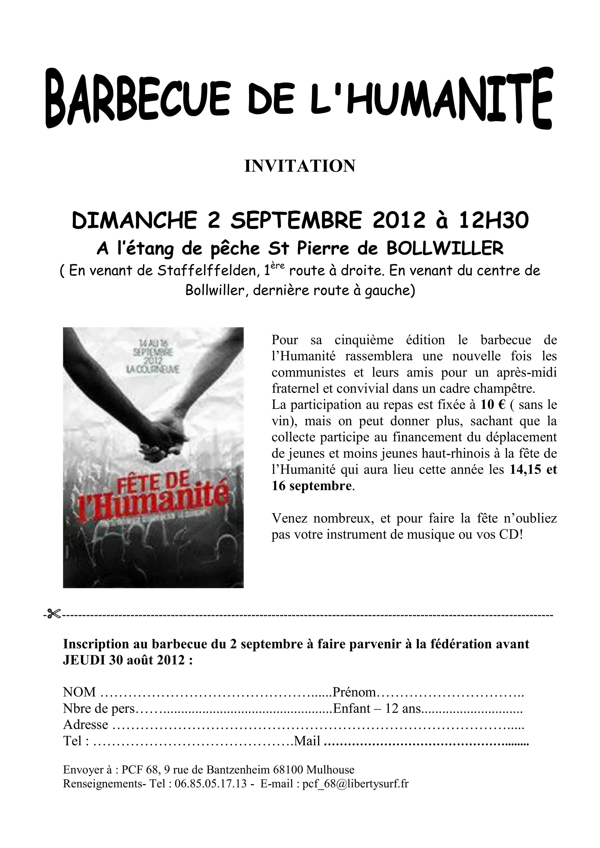 Le 2 septembre 2012, un barbecue de l'humanité se tiendra à l'étang de pêche Saint Pierre de Bollwiller, rassemblant communistes et amis pour un après-midi convivial. La participation est de 10 € et sert à financer le déplacement de participants à la fête de l'humanité en septembre. Les inscriptions doivent être envoyées à la fédération avant le 30 août 2012.