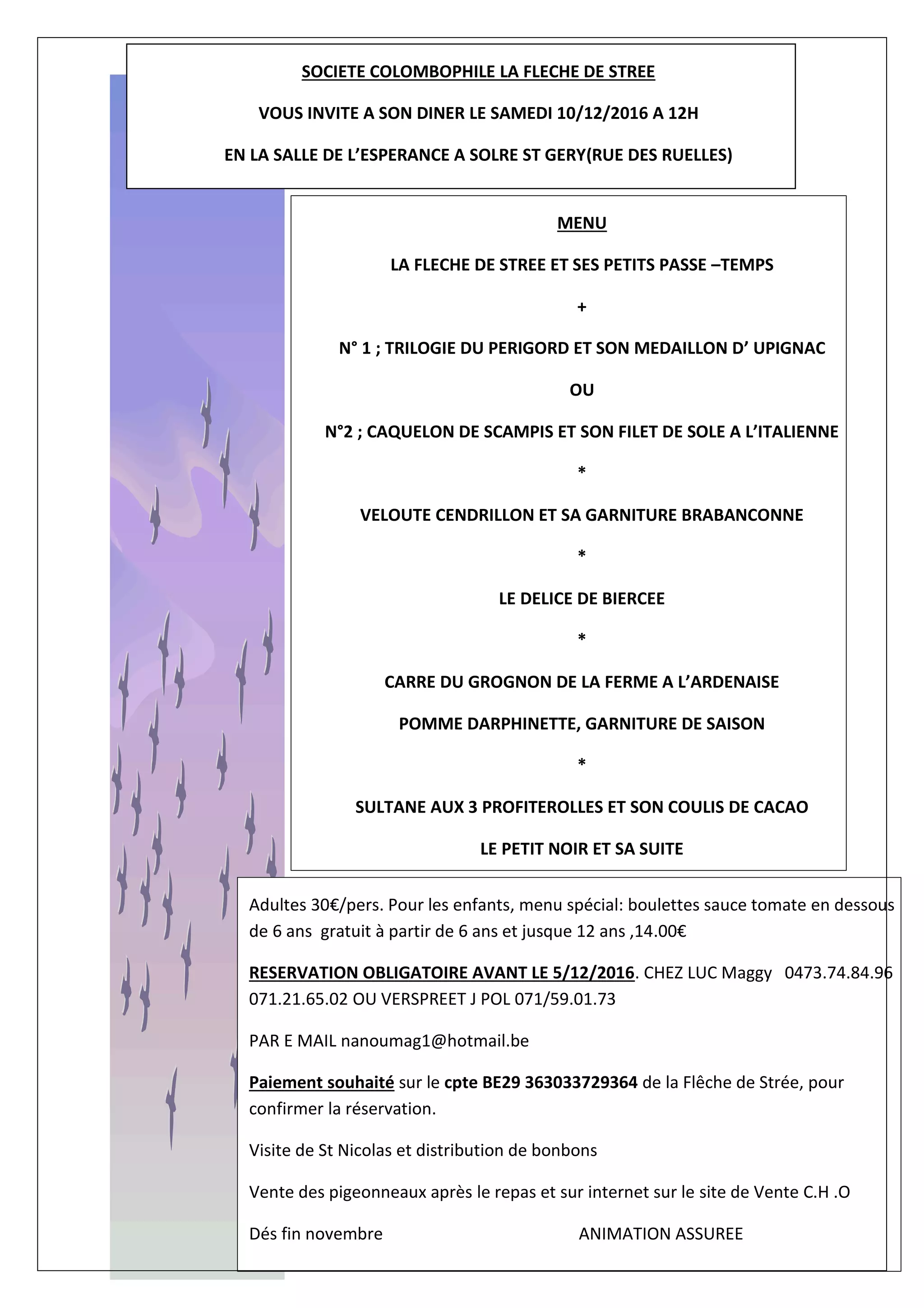 La Société Colombophile La Flèche de Strée organise un dîner le 10 décembre 2016 avec un menu varié au prix de 30€ par adulte et un menu spécial pour les enfants. Les réservations doivent être effectuées avant le 5 décembre et le paiement est nécessaire pour confirmer la réservation. Des animations musicales, une visite de Saint Nicolas et la vente de pigeonneaux seront également présentes lors de l'événement.
