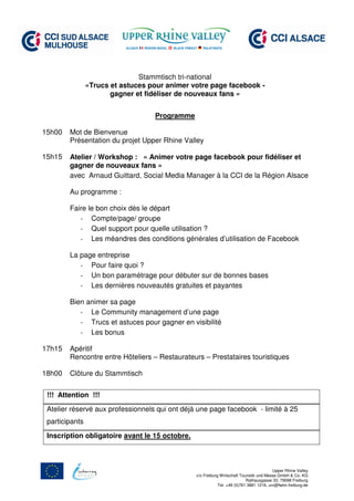 L'atelier 'trucs et astuces pour animer votre page Facebook' se tiendra le 23 octobre 2012 à Mulhouse, destiné aux professionnels du secteur du tourisme souhaitant optimiser leur utilisation de Facebook. Les participants apprendront à configurer efficacement leur page, à animer leur communauté et à gagner en visibilité, avec un apéritif prévu pour favoriser les échanges. La participation est gratuite mais limitée à 25 personnes, avec une inscription obligatoire avant le 15 octobre.