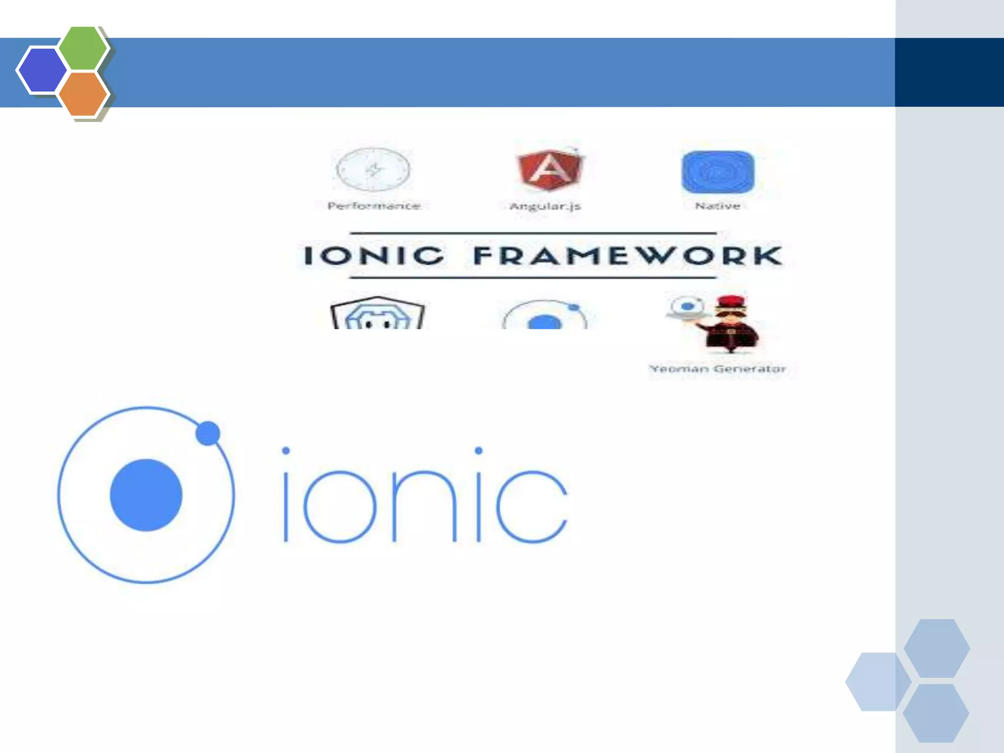 Ce document présente le développement d'applications mobiles hybrides en utilisant le framework Ionic, basé sur AngularJS et Cordova. Il décrit les différences entre les applications natives, web et hybrides, ainsi que les concepts clés d'AngularJS tels que les contrôleurs, modules et services. Enfin, il aborde les spécificités de Node.js, npm et Cordova, y compris l'installation, l'architecture et des exemples de plugins.