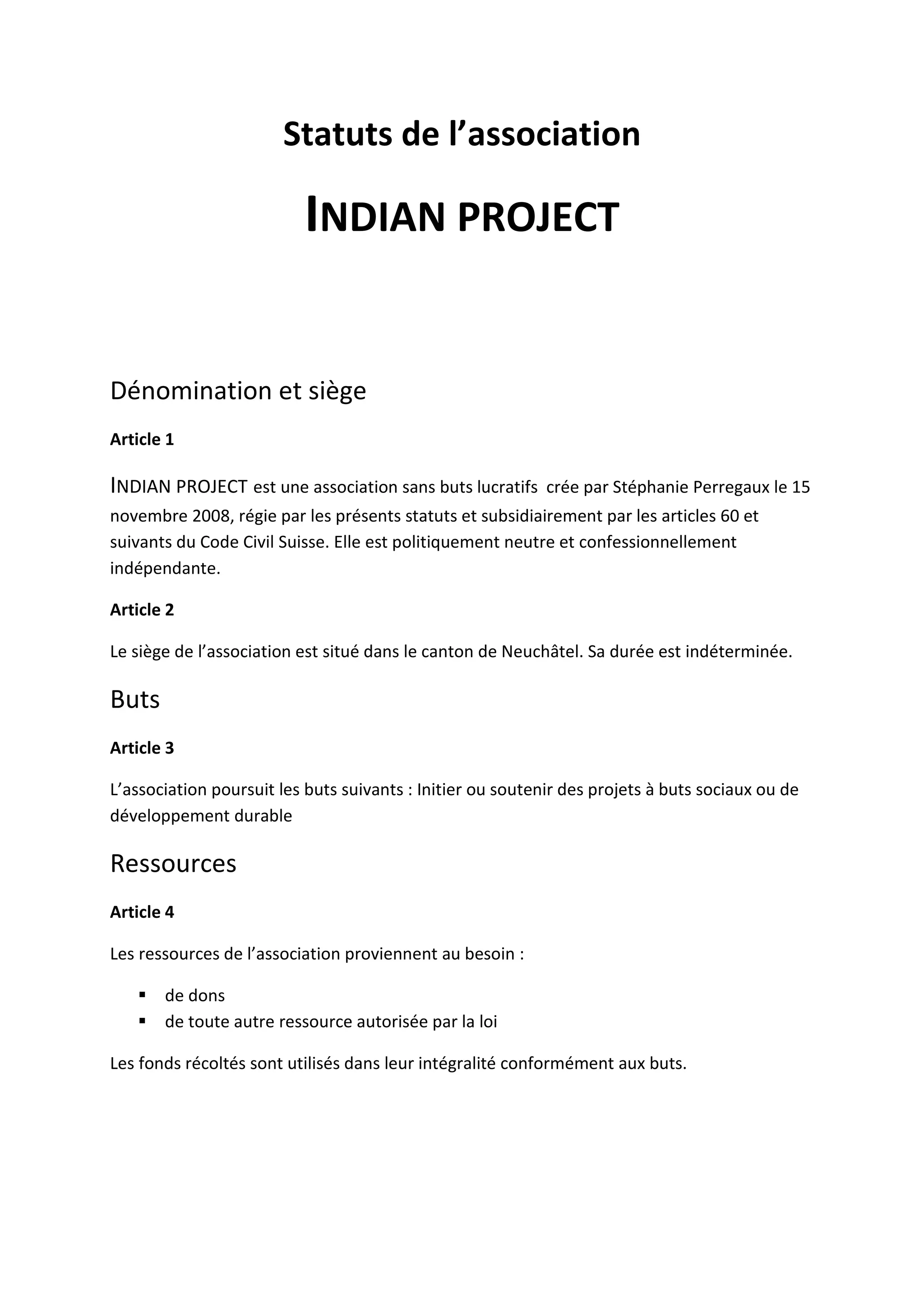 L'association Indian Project, fondée par Stéphanie Perregaux le 15 novembre 2008, a pour but de soutenir des projets sociaux et de développement durable. Elle est régie par des statuts qui définissent son organisation, les droits et devoirs de ses membres ainsi que le fonctionnement de ses organes, notamment l'assemblée générale et le comité. L'association est politiquement neutre, sans cotisations pour ses membres, et ses ressources proviennent de dons et d'autres sources légales.