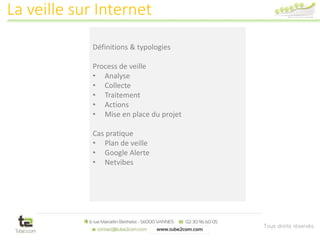 Le document présente un cadre pour la veille sur internet, qui englobe l'analyse, la collecte, le traitement et l'action en matière d'information pour mieux comprendre l'environnement d'une entreprise. Différentes typologies de veille sont décrites, telles que la veille concurrentielle, commerciale, marketing et juridique, chacune visant à surveiller des domaines spécifiques. Le processus de veille comprend également des étapes clés, de la définition des objectifs à la diffusion des informations récoltées.