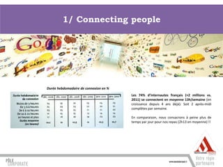 En 2011-2012, 74% des internautes français passent en moyenne 13 heures par semaine en ligne, avec une popularité croissante des connexions via smartphones et Wi-Fi. L'actualité est la thématique la plus consultée, et les internautes partagent facilement des vidéos, tandis que le marketing viral influence fortement les choix des consommateurs. Près de 30 millions d'internautes ont effectué des achats en ligne, principalement des livres et des billets de train.