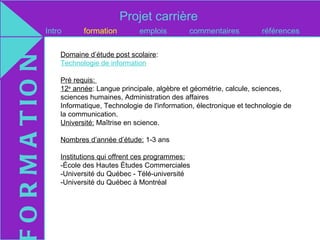 Le document présente plusieurs parcours professionnels dans le domaine de l'informatique et de la technologie, notamment les exigences éducatives, les salaires et les institutions académiques. De nombreux métiers sont abordés, allant des spécialistes en réseaux informatiques aux développeurs de jeux vidéo, avec un aperçu des intérêts et des préférences personnelles de l'auteur. L'auteur exprime son manque d'intérêt pour certains métiers tout en considérant l'option du développement de jeux vidéo en raison de son intérêt pour le dessin.