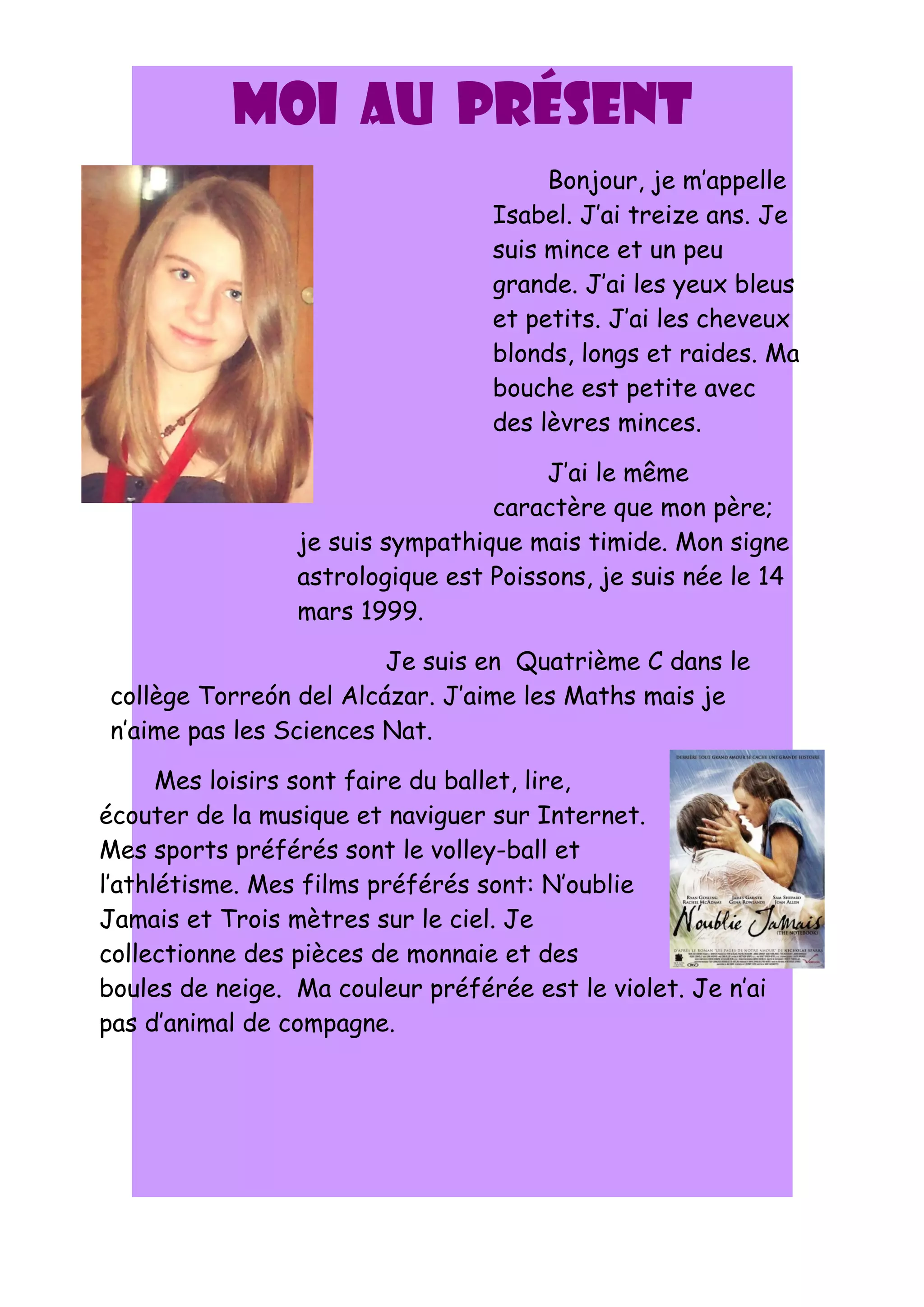 Isabel, une jeune fille de treize ans, se décrit comme mince et grande avec des cheveux blonds et des yeux bleus. Elle aime les maths, fait du ballet, et apprécie le volley-ball, tout en collectionnant des pièces de monnaie. Son caractère est sympathique mais timide, et sa couleur préférée est le violet.