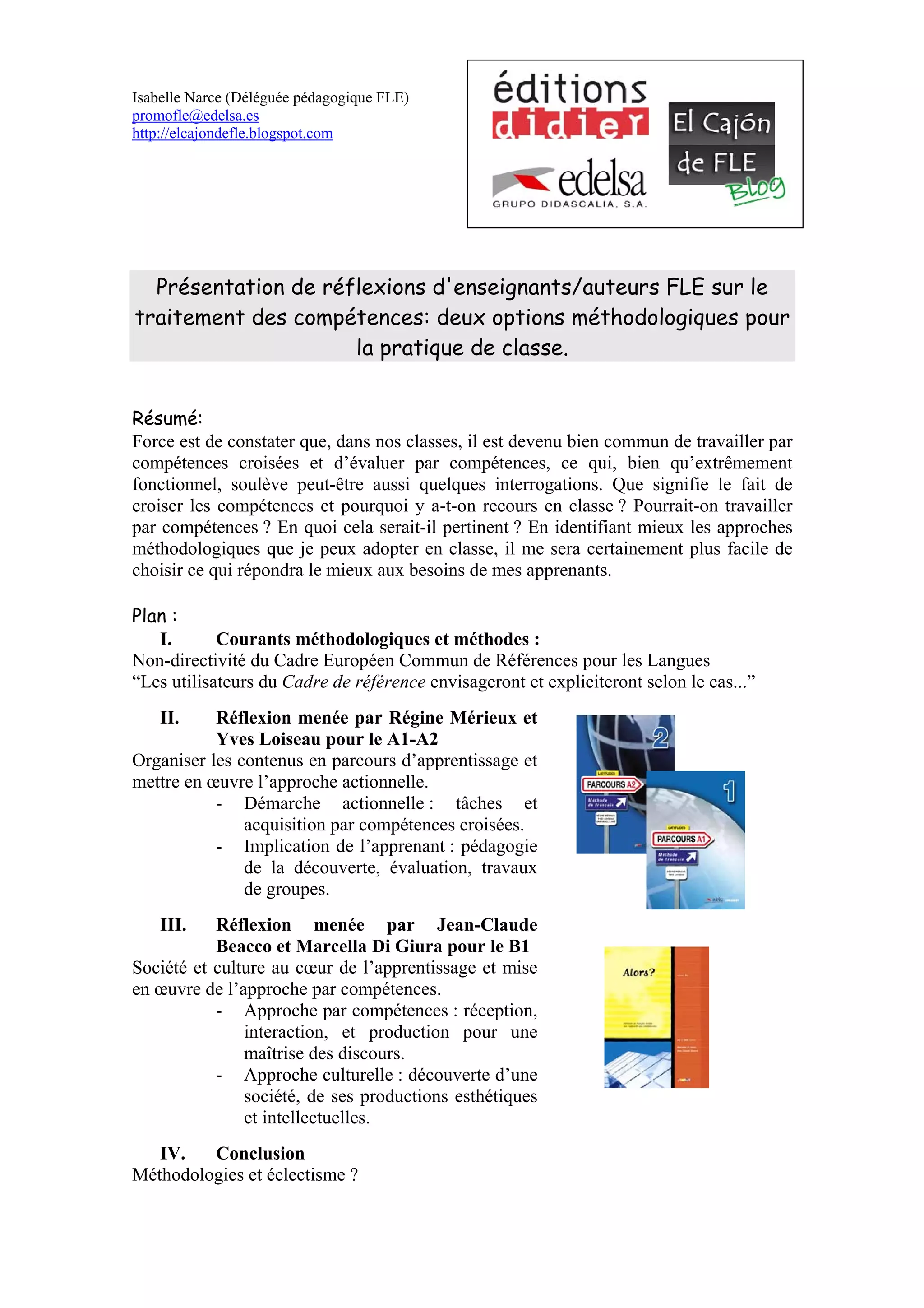 Le document présente des réflexions sur l'enseignement des langues étrangères, en particulier l'approche par compétences et son efficacité en classe. Il aborde les méthodes d'enseignement et d'évaluation tout en questionnant la pertinence de croiser les compétences. Plusieurs courants méthodologiques sont discutés, mettant l'accent sur l'implication de l'apprenant et l'intégration des dimensions culturelles dans l'apprentissage.