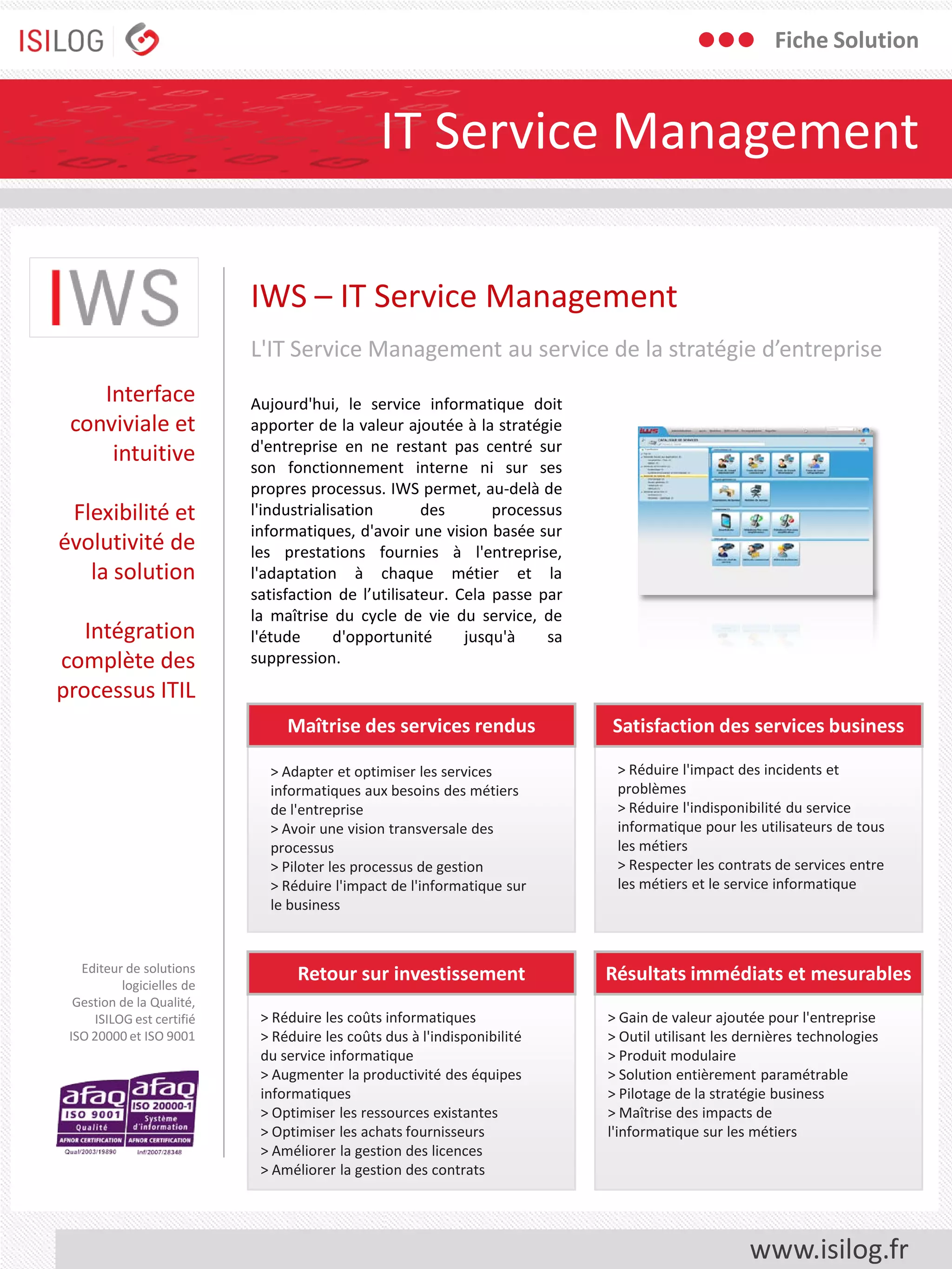 Le document présente la solution IWS d'Isilog pour la gestion des services informatiques, soulignant son interface intuitive et sa flexibilité. IWS intègre les processus ITIL pour optimiser les services informatiques en réponse aux besoins des entreprises tout en améliorant la satisfaction utilisateur. Ce logiciel modulaire permet une mise en œuvre rapide et offre des outils graphiques de pilotage et de reporting en temps réel.