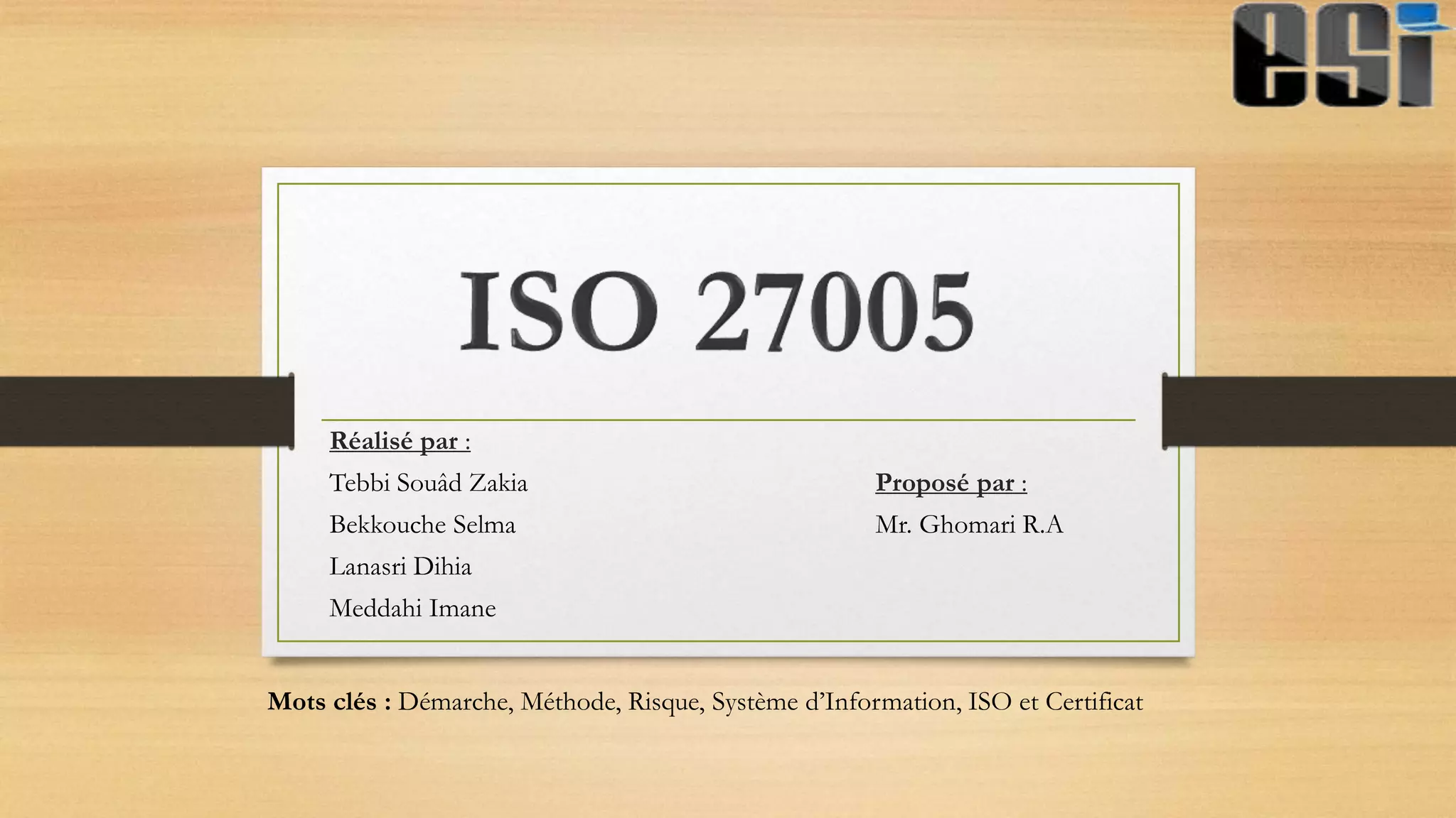 Le document présente la norme ISO 27005, une approche de gestion des risques en sécurité des systèmes d'information, publiée en 2008 en anglais et en 2009 en français. Il souligne ses avantages, tels que sa flexibilité et sa structure, tout en notant des limites comme l'absence de certification pour les systèmes, par rapport à la norme ISO 27001. Le texte compare également ISO 27005 avec d'autres méthodes françaises comme EBIOS et MEHARI, suggérant qu'une maîtrise de ces méthodes facilite l'application de la norme ISO 27005.