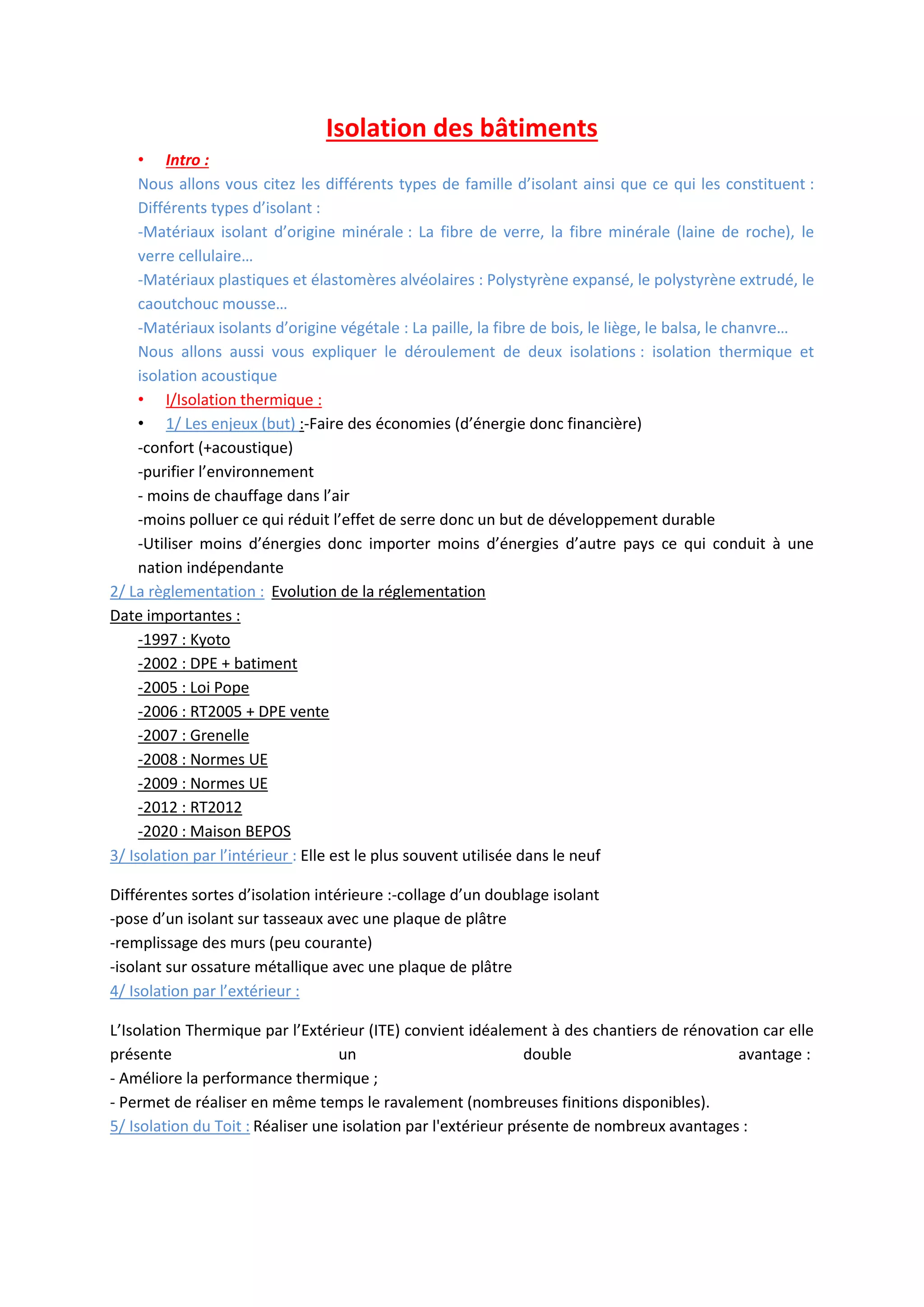 Le document décrit les différents types de matériaux isolants utilisés dans la construction, les enjeux de l'isolation thermique et acoustique, ainsi que les réglementations associées à ces procédés. Il souligne l'importance de choisir les bonnes techniques d'isolation pour améliorer le confort des occupants et réduire les nuisances sonores et énergétiques. En conclusion, l'isolation acoustique et thermique sont essentielles pour offrir un confort optimal au sein d'une habitation.
