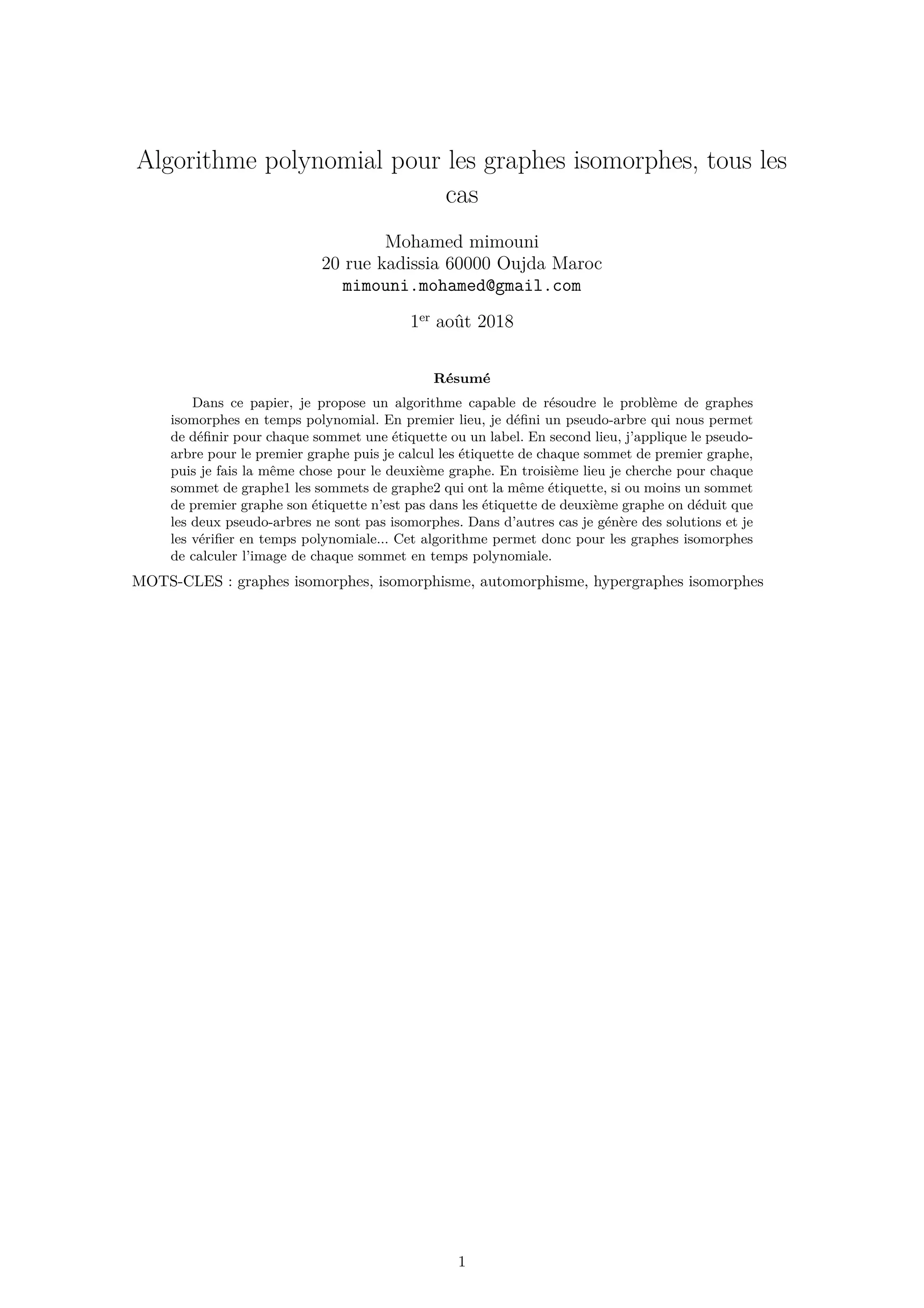 Ce document présente un algorithme polynomial pour résoudre le problème des graphes isomorphes en utilisant des pseudo-arbres pour étiqueter les sommets des graphes. L'algorithme calcule les étiquettes et vérifie l'isomorphisme entre deux graphes en temps polynomial, en assurant que chaque sommet d'un graphe est relié à un sommet correspondant dans l'autre graphe. La complexité de l'algorithme est estimée à O(n²) pour le traitement des graphes connectés.