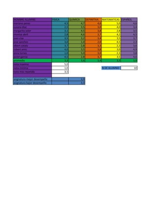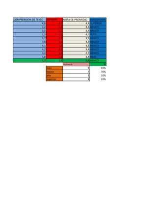 Le document présente les résultats académiques de dix élèves dans différentes matières, incluant des notes ainsi que des statistiques sommaires comme la note moyenne et la note maximale. La note la plus souvent répétée est de 3,5, tandis que les matières de meilleure et de moindre performance sont respectivement évaluées à 3,9 et 3,3. En termes de compréhension de texte, la majorité des élèves ont un niveau de performance basique.