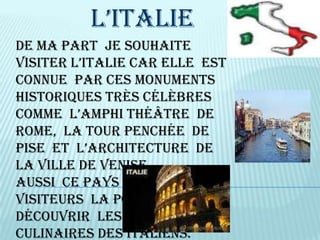 L'Italie est réputée pour ses monuments historiques célèbres tels que l'amphithéâtre de Rome, la tour penchée de Pise et l'architecture de Venise. Le pays permet également de découvrir les traditions culinaires italiennes. L'auteur exprime un fort désir de visiter ce pays.