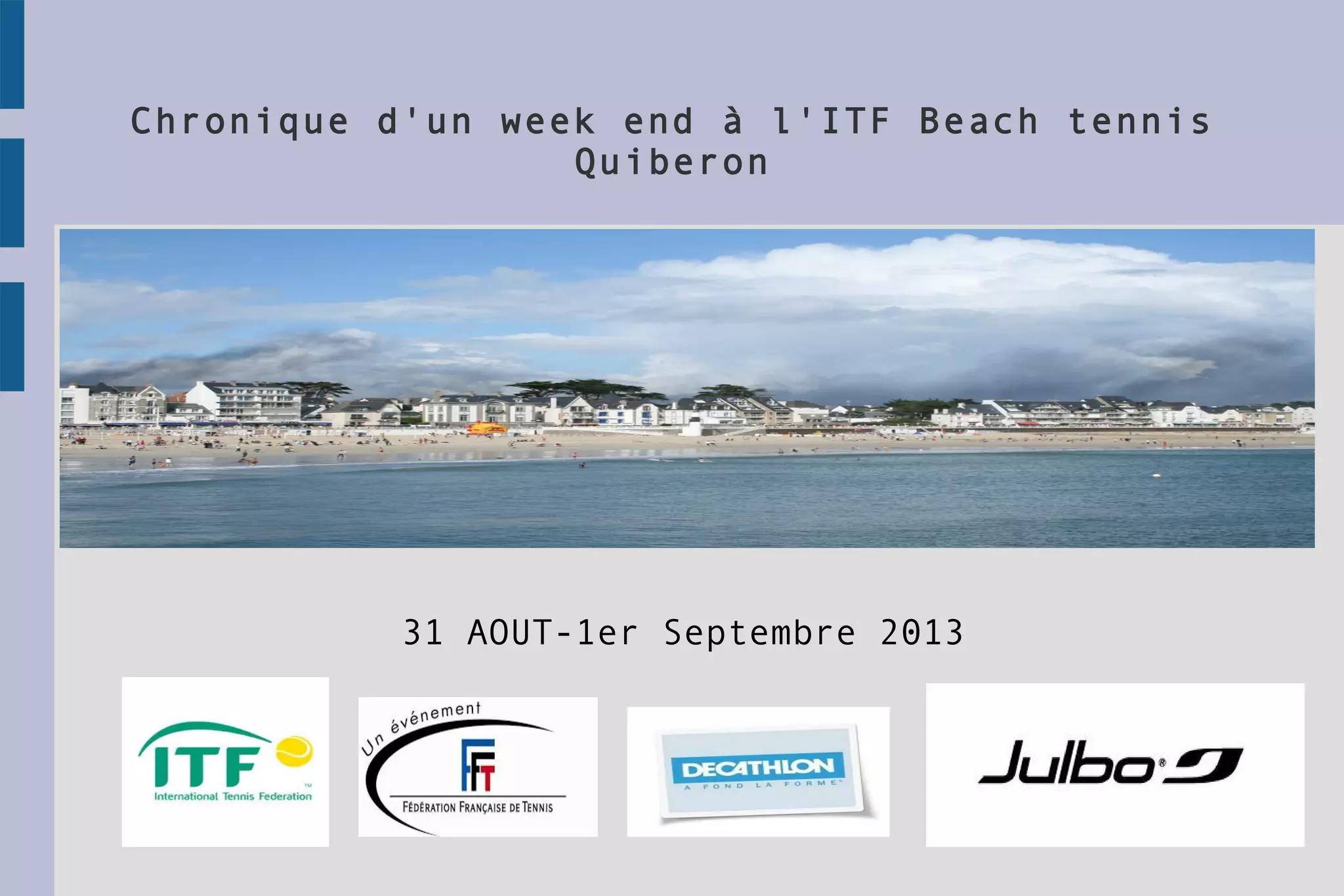 Le document décrit un week-end à l'ITF Beach Tennis de Quiberon, incluant des informations sur l'accès à la ville, les options d'hébergement et le programme du tournoi. Quiberon, située dans le Morbihan en Bretagne, est facilement accessible par route, train ou avion. L'événement, avec un prize money de 2000 euros, se déroule du 31 août au 1er septembre 2013, avec des activités de loisirs organisées pour les participants.