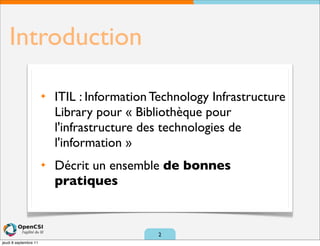 Le document présente ITIL et la notion de CMDB, soulignant son rôle dans la gestion des informations techniques d'un système d'information. Il aborde également les objectifs de représentation des composants et d'analyse d'impact liée aux dépendances entre applications. Enfin, il décrit l'application ITOP, ses avantages en termes de flexibilité et d'intégration avec d'autres outils.