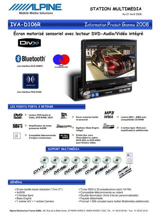 Le document présente les caractéristiques d'une station multimédia lancée le 1er avril 2008, incluant un écran motorisé tactile de 17 cm avec lecteur DVD-Audio/vidéo intégré. Il met en avant des fonctionnalités telles que la compatibilité avec divers formats audio, l'amplification de haute puissance, et plusieurs entrées pour périphériques externes. La station est conçue pour une utilisation polyvalente dans les véhicules avec un affichage personnalisé et un contrôle au volant.