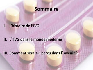 Le document traite de l'histoire et de la situation actuelle de l'IVG, en mettant en évidence les débats qui l'entourent depuis 1980 et les chiffres liés à cette pratique en France et dans le monde. Il souligne le nombre élevé d'avortements, les dangers des avortements clandestins et les divergences idéologiques sur le sujet. Enfin, il pose la question de l'avenir de l'avortement dans un contexte de changements sociétaux.