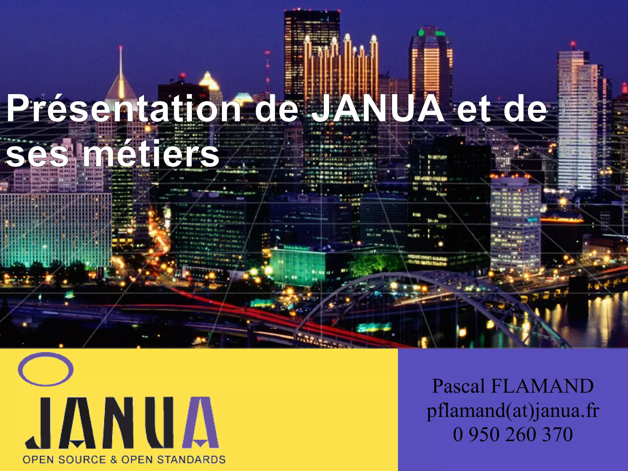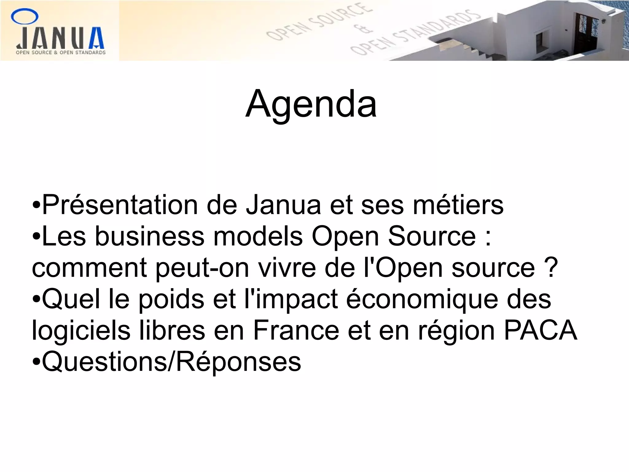 Le document présente Janua, une société de services spécialisée dans l'open source et l'édition de logiciels, en détaillant ses métiers, ses prestations et son impact économique en France, notamment dans la région PACA. Il aborde également les modèles économiques associés à l'industrie des logiciels libres et leur capacité à générer de la valeur tout en exposant les enjeux des licences propriétaires. Enfin, il souligne l'importance du libre dans la création d'emplois locaux et sa résistance à la délocalisation.