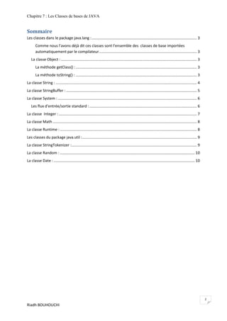 Ce chapitre présente les classes de base du langage Java, en détaillant leur fonctionnement et leur utilisation à travers des exemples. Des classes telles que Object, String, StringBuffer, System, Integer, et Math sont abordées, ainsi que des classes utilitaires du package java.util. L'objectif est de fournir une compréhension des classes fondamentales de Java pour leur manipulation efficace.