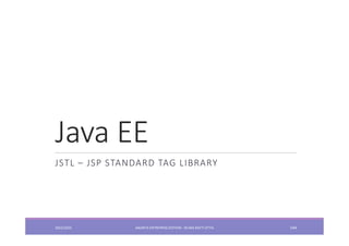 Le document traite de la bibliothèque standard JSTL (JavaServer Pages Standard Tag Library), détaillant ses composants, comme les core taglibs, le cycle de vie des tags et la création de tags personnalisés. Il fournit également des exemples de syntaxe pour afficher des informations dynamiques et gérer des conditions via JSTL. Enfin, il explique comment déclarer des variables et évaluer des expressions dans les JSP à l'aide de JSTL.