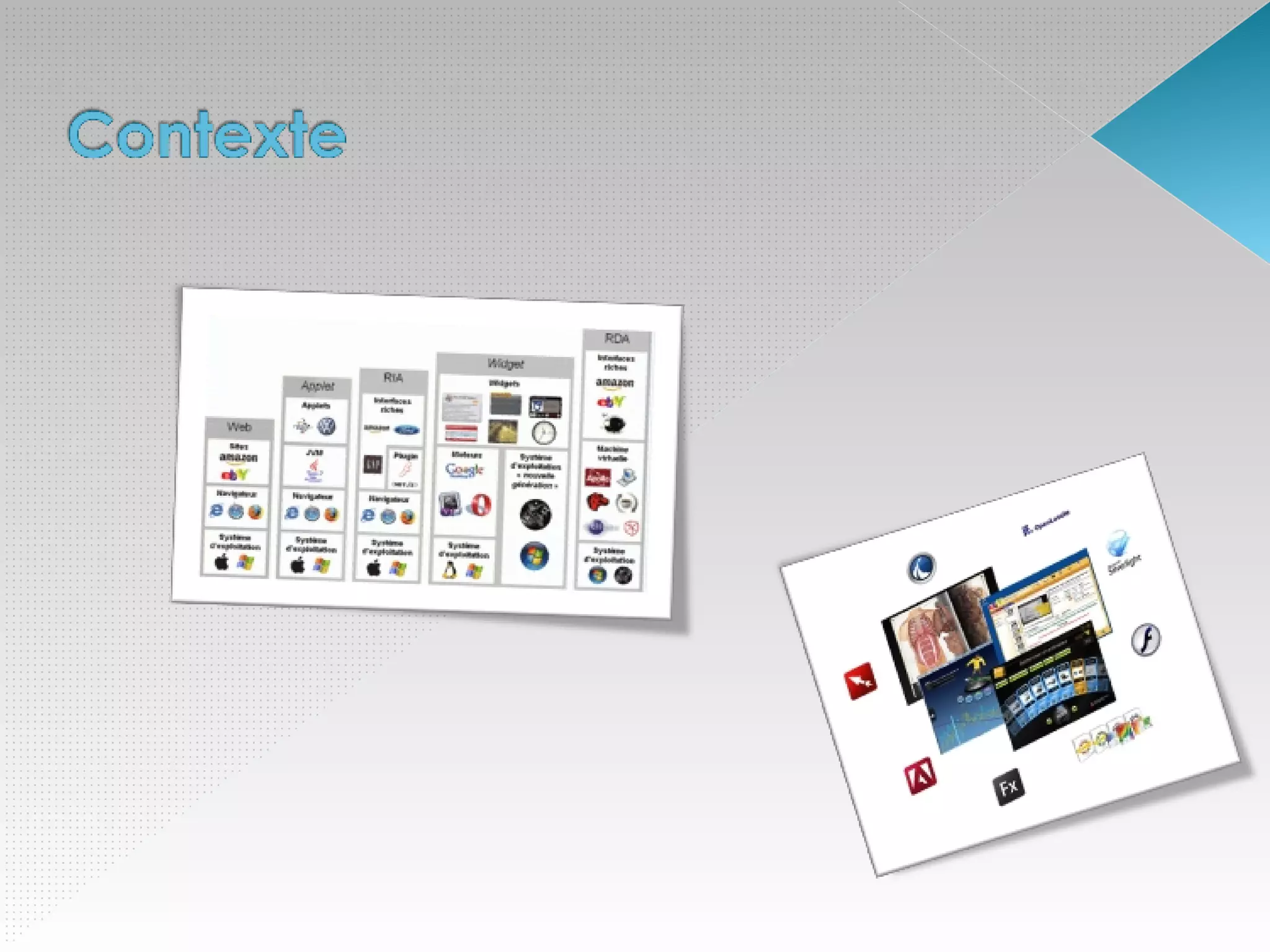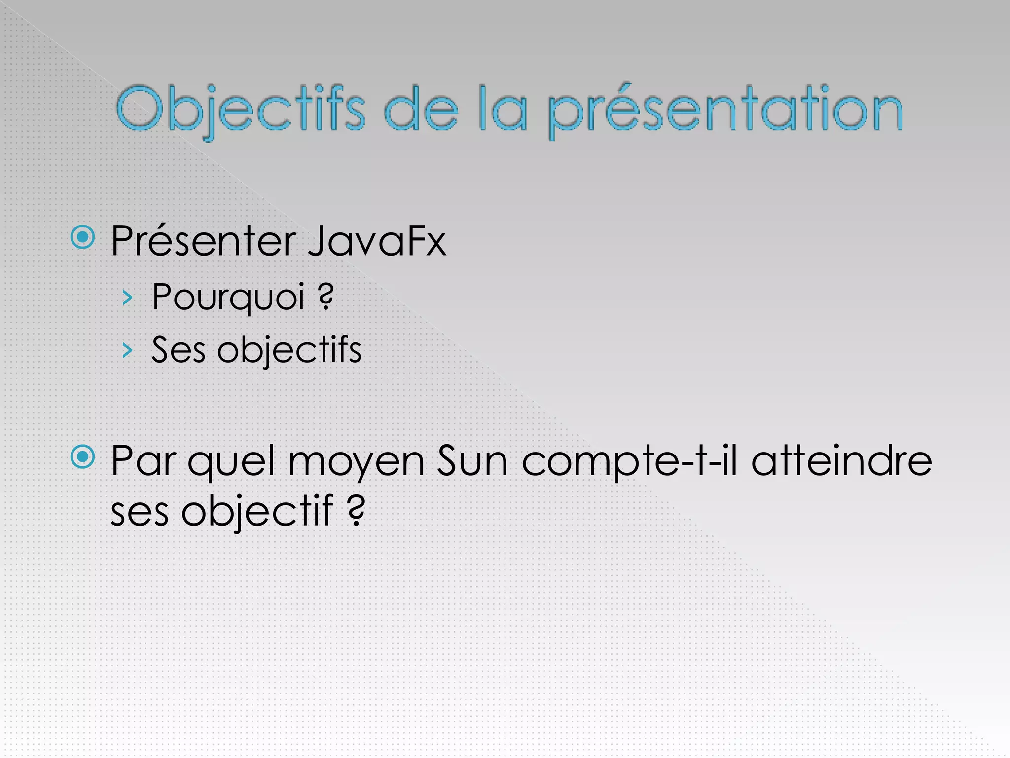 JavaFX est un ensemble de produits et technologies créé par Sun Microsystems pour intégrer le marché des Rich Internet Applications (RIA) et améliorer l'expérience utilisateur. Il inclut JavaFX Script, un langage conçu pour le développement d'interfaces riches, et des outils pour développeurs et designers, bien que certaines faiblesses subsistent face à d'autres technologies. Le document couvre également les aspects techniques et l'évolution des outils associés à JavaFX, tout en soulignant ses objectifs et contextes d'utilisation.