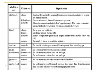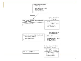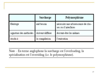 Le document traite des concepts clés de la programmation orientée objet, notamment l'héritage, le polymorphisme, la surcharge de méthodes, et l'utilisation des références 'this' et 'super'. Il explique comment l'héritage permet aux classes de bénéficier des attributs et méthodes d'autres classes, facilitant ainsi la spécialisation, et comment le polymorphisme permet de traiter des objets de manière dynamique. Enfin, il met en lumière l'importance des méthodes finales et des constructeurs dans la gestion des classes en Java.
