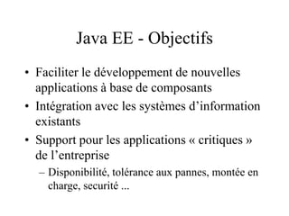 Java EE, ou Java Enterprise Edition, est une plateforme visant à simplifier le développement d'applications basées sur des composants tout en intégrant des systèmes d'information existants et en soutenant des applications critiques en matière de sécurité, disponibilité et performances. Elle évolue depuis 1997 et inclut des spécifications comme les EJB (Enterprise JavaBeans), JMS (Java Messaging Service) et JPA (Java Persistence API), permettant la gestion des transactions, la persistance, et la communication entre applications. Le document aborde aussi l'architecture multi-tiers de Java EE, la configuration et le déploiement des composants, ainsi que les annotations et la gestion des transactions.