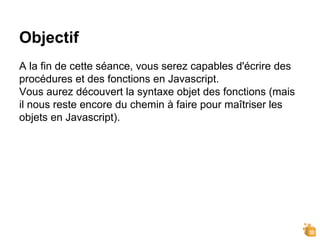 Le document explique les fonctions en JavaScript, en visant à ce que les lecteurs apprennent à écrire des procédures et fonctions. Il inclut des exemples de code et des instructions pour construire une calculatrice simple. Des références et une évaluation des connaissances sont également fournies.