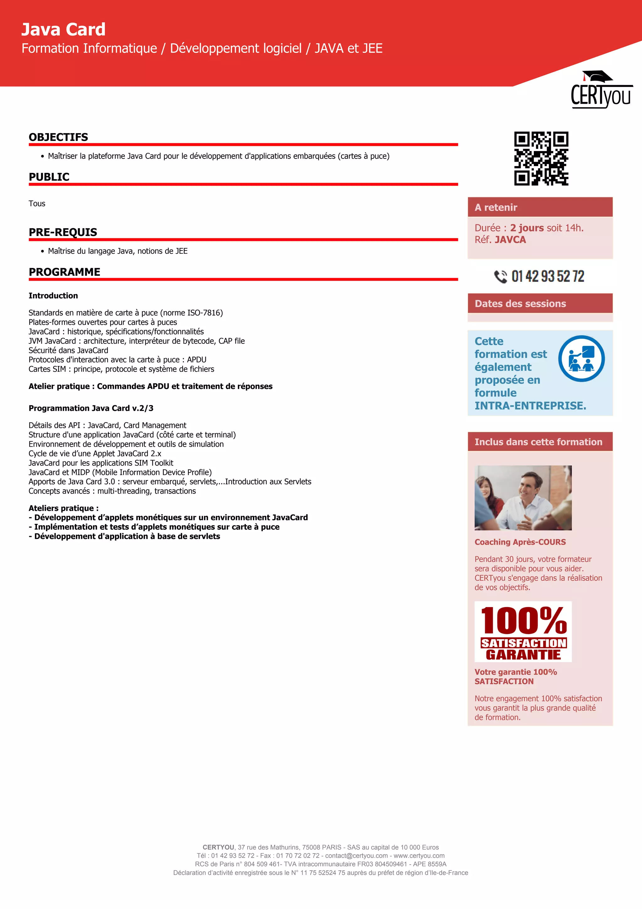 Certyou propose une formation de 2 jours sur la plateforme Java Card pour le développement d'applications embarquées sur cartes à puce. Le programme couvre des éléments essentiels tels que les standards de carte à puce, l'architecture JVM Java Card, et comprend des ateliers pratiques sur le développement d'applets monétiques. La formation inclut également un coaching après-cours pendant 30 jours pour garantir la satisfaction des participants.