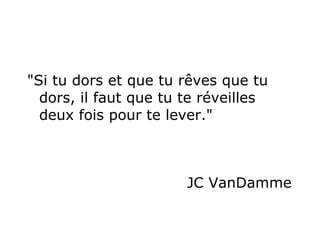 Le document présente une série de pensées et d'observations humoristiques de Jean-Claude Van Damme, illustrant sa vision particulière du monde à travers des aphorismes. Chaque citation aborde des thèmes variés allant de la perception de la réalité à des réflexions sur la vie et la nature. Le ton est léger et décalé, mêlant sagesse et absurdité.